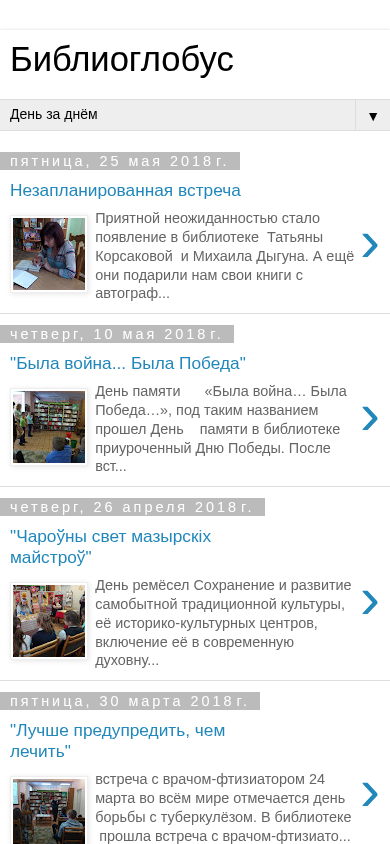 | AI-анализ | The web project "Библиоглобус" is a blog showcasing various events and activities organized in a Belarusian library. The project includes posts about book reading, film screening, author visits, and children's competitions. The blog also features posts about exhibitions and the library's working hours. The title of the blog is "Библиоглобус" and it was last updated on May 25, 2018. Popular keywords associated with the blog include "share," "Библиоглобус," "day," "author," "comments," "electronic mail," "mail," "write," "blog," "publish," "facebook," and "pinterest." Some recent posts include an unexpected encounter with authors Tatiana Korsakova and Mikhail Dygun, a Day of Memory event commemorating the Day of Victory, |