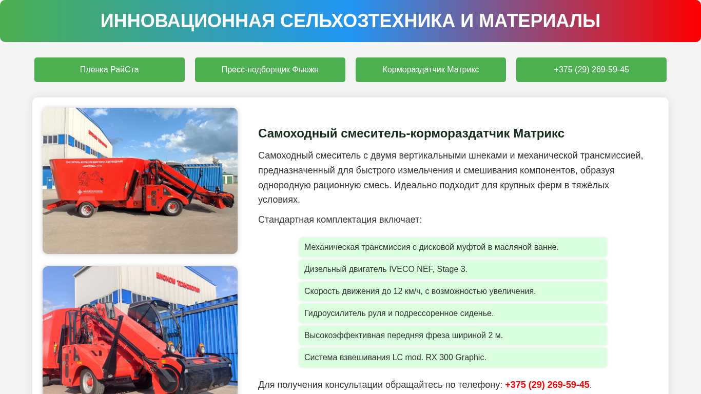 | AI-анализ | The web project "Samohodnyy Smeysitel - OOO Biokom Technologiya" is an innovative agro-technology and materials company based in Belarus. They specialize in the production and sale of a self-propelled mixer-feeder, known as a "Samohodnyy Smeysitel-Matris" or "Self-Propelled Mixer-Matrix". The mixer-feeder features two vertical augers and a mechanical transmission, designed for efficient and uniform blending of feed components to create a homogeneous ration mix. The product is suitable for large farms operating in challenging conditions. Standard equipment includes a mechanical transmission with a disc clutch in an oil bath, a diesel engine from IVECO NEF, Stage 3, a hydraulic power steering system, and a suspension seat. Additionally, the vehicle comes with a 2-m |