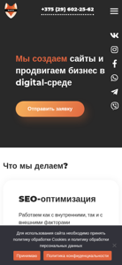 | AI-анализ | This website is a web development and promotion studio named WebFox. The description suggests that the team specializes in helping clients promote their brands online and develops effective advertising solutions for businesses. The services offered include website creation, development, and monitoring, leading to sales growth and new clients. The website likely includes a portfolio, information on services, a blog, and contact information. The primary language for this site is Belarusian, and the contact number is +375 (29) 602-25-62. The studio focuses on creating websites and promoting businesses in the digital world and offers options for sending a request for a quote. Services include SEO optimization, web design, website audits, contextual advertising, and social media marketing. The studio boasts a real-world track record of placing over 100 projects in the top 10 search engine results, adherence to deadlines |