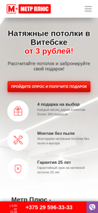 SEO-описаниеЛучшие ЦЕНЫ на Натяжные потолки в Витебске и области в Метр Плюс ⚡️ Стоимость от 3 руб ⭐ купить в Рассрочку 0% до 12 мес. ✅ Халва, ✅ Черепаха ⏩ Потолок в подарок!