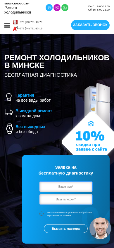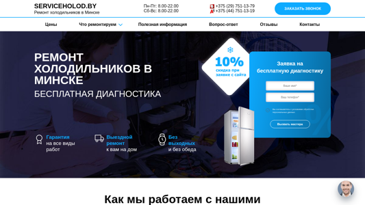 | AI-анализ | This website is a domestic appliance repair service based in Minsk, Belarus, specializing in the repair of refrigerators. The title of the website is "Ремонт холодильников в Минске с выездом на дом, недорого" which translates to "Refrigerator repair in Minsk with home visit, affordably." The description mentions that the company provides a call-out service for refrigerator repairs in Minsk, with quick resolution of issues and competitive pricing. The top keywords include "ремонт" (repair), "холодильников" (refrigerators), and "холодильника" (refrigerator), indicating the primary focus of the business. The website offers repair services for various brands such as Atlant, Gorenje, Sharp, LG, DAEWOO, VEST |