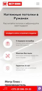 | SEO-описание | Приобритайте натяжные потолки в Ружанах по максимально выгодным ценам в РАССРОЧКУ до 12 месяцев. без участия банка и переплат. Натяжные потолки Метр плюс это всегда ВЫГОДНО. |