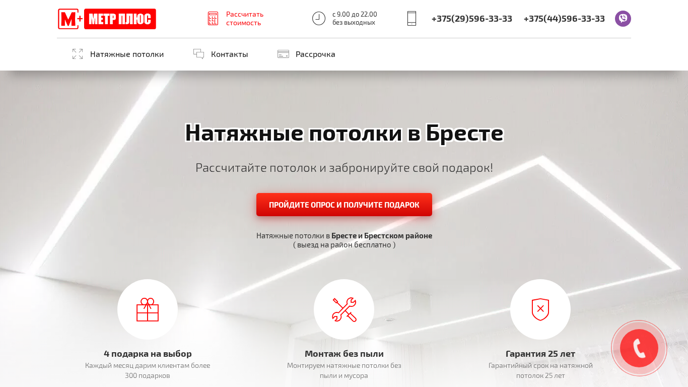 | SEO-описание | Приобритайте натяжные потолки в Бресте по максимально выгодным ценам в РАССРОЧКУ до 12 месяцев. без участия банка и переплат. Натяжные потолки Метр Плюс это всегда ВЫГОДНО. |