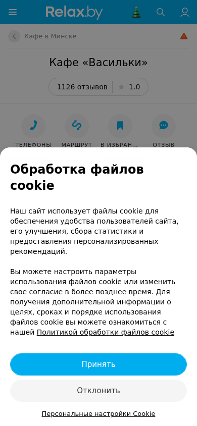 | AI-анализ | This website is an online platform for the "Васильки кафе" located at пр-т Партизанский 150а in Minsk, Belarus. The platform provides users with menu prices, customer reviews, the cafe's address on a map, and online table reservation through Relax.by. It also includes a search feature for places and events, a favorites list, and a login function. The website has 1126 customer reviews with an average rating of 1.0. Users can report errors, suggest corrections, and leave their own reviews. The cafe is located in the MOMO shopping center and is open until 23:00. It is near the Mogilevskaya Metro station and the Zavodskoy District. The website also displays information about nearby attractions, such as the MАЗ-Dakar sports |