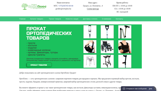 | AI-анализ | The website is an orthopedic salon called ОртоПлюс located in Grodno, Belarus. It provides a catalog of orthopedic products for children and adults from leading manufacturers. The contact information includes an address on ul. Popovich, 4, and a phone number +375(29)745-64-44. The store's hours of operation are Monday to Friday from 10:00 to 19:00 and Saturdays from 10:00 to 18:00, with Sundays being a day off. The website offers a variety of orthopedic items for sale and rent such as braces, orthoses, compression garments, shoe inserts, rehabilitation tools, and crutches. To rent an item, visitors can either come to the store or call the phone number provided. The |
