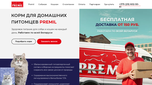 | AI-анализ | --- The portal Premil.by is an e-commerce website specializing in the sale of animal feed for dogs and cats. The company operates in Minsk and throughout Belarus. The website offers various Premil brands for both dogs and cats, providing detailed information about the ingredients and features of each product. Visitors can place orders for delivery or pick up in-person at selected locations in Minsk. The website also includes a phone number for customer inquiries and a section for ordering a callback. Minimum orders and prices are displayed, and the site offers various delivery options, including free delivery in Minsk with a discount on all Premil pet food. The website also includes a link to shop on Wildberries, another e-commerce platform, offering a wider selection and regular promotions. The Premil website aims to provide high-quality, balanced, and hypoallergenic pet food with a focus on natural |