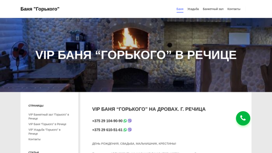 | Название / Заголовок | VIP Баня Горького в Речице | Речица, ул. Горького, 60/1 |