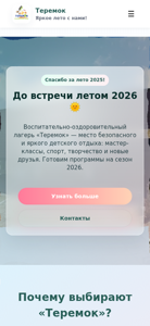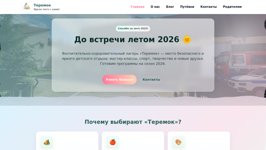 | AI-анализ | This website is a responsive, adaption of the "Liquid glass / iOS-like" template for the educational and recreational camp "TeremoK". The website features a improved mobile gallery, and utilizes a modern design with a light color palette and clean typography. The header contains a fixed navigation bar with links to the homepage, camp information, camp programs, and contacts. The background is a linear gradient that transitions from a light blue to the website's background color. The website uses a maximum container width of 1180 pixels with a margin of 20 pixels auto for horizontal centering, and employs utility spacing classes for consistent margin sizing. The text utilities include heading levels one and two, and a lead paragraph style for body text. Links are styled with the primary color, and hover effects include an underline. The website is optimized for both desktop and |