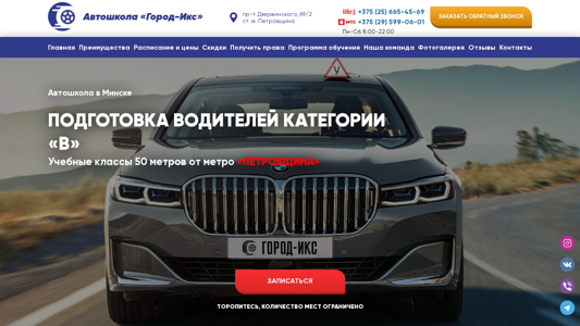 | AI-анализ | This website is a car driving school located in the Moscow district of Minsk, Belarus. The title of the website is "Автошкола «Город-Икс»" and it offers driving lessons. The description tag is blank. The keywords for this website include 'auto school', 'Minsk', 'Moscow district', 'driving lessons', 'pr-t Dzerzhynskogo', 'Petrovschina', 'phone numbers' (25 665-45-69, 29 235-51-51, 29 599-06-01), and the top words are 'Заказать', 'обратный звонок'. The website uses Yandex Metrika for tracking website usage statistics. The school's address is given as pr-t Dzerzhynsk |