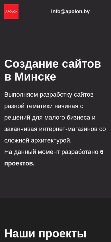 | AI-анализ | title: Веб-студия APOLON | Создание сайтов в Минске description: A web studio in Minsk that develops websites of various themes, from small business solutions to complex e-commerce projects. Currently, six projects have been completed. All projects are part of the studio's portfolio regardless of cost or complexity. Recent projects include Metal Frameworks for Furniture, Mobile 24-hour Tire Service, ArioTech Gas Production, Kubik-shop.by LEGO Online Store, Apartment Renovations, and Sarudi Thermal Insulation Production. Contact information: Email: info@apolon.by, Telegram, WhatsApp, Viber. City: Minsk. Copyright 2017-2021. |