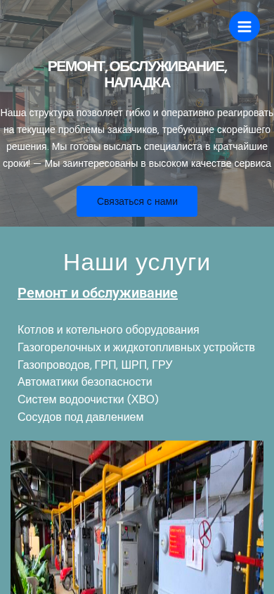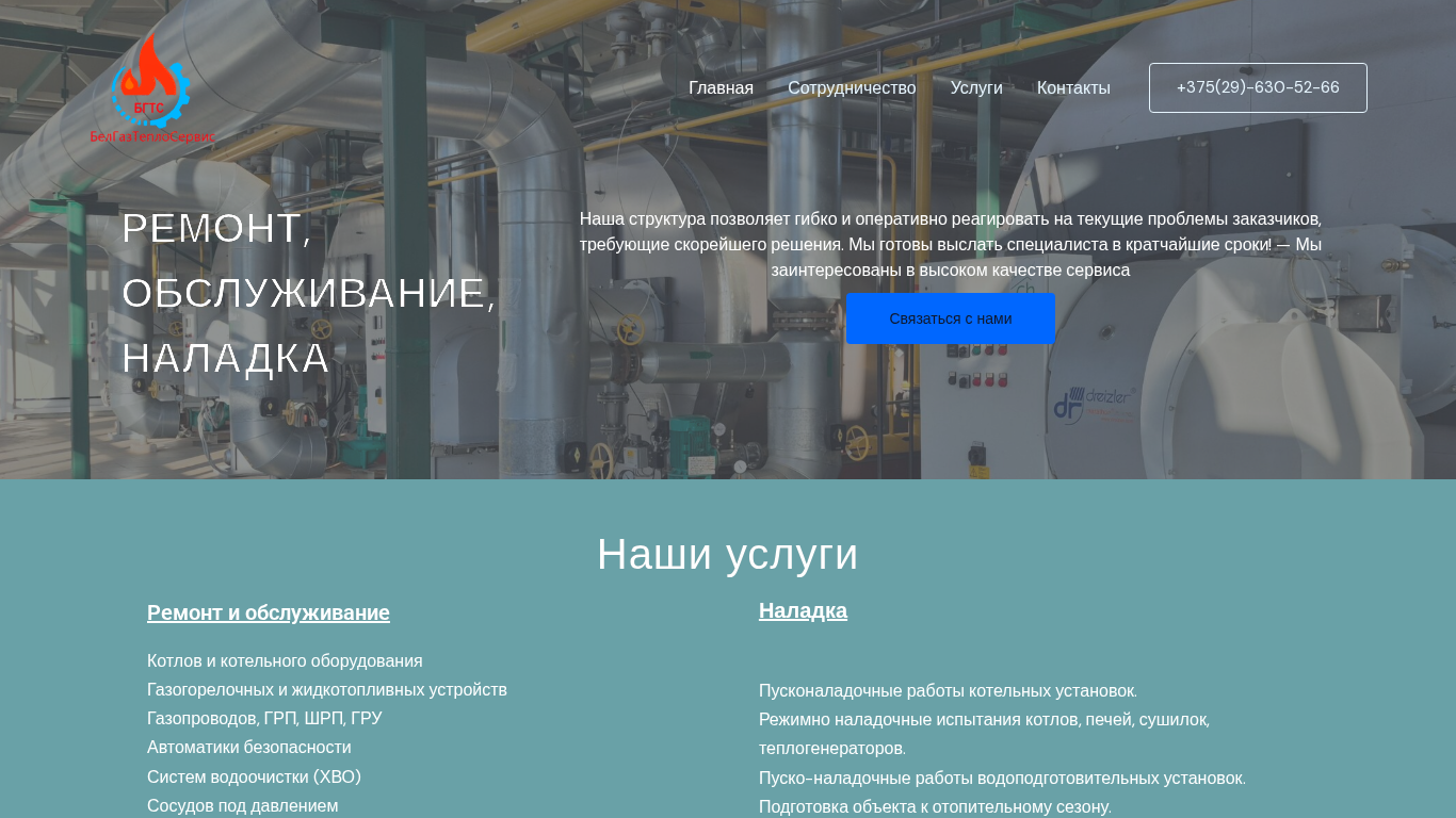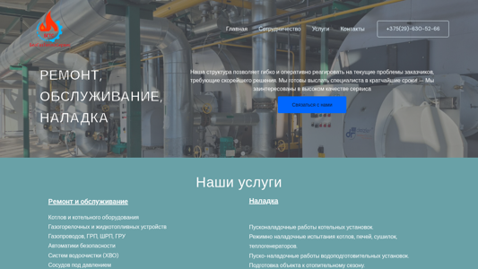 title: Главная страница description: This online resource is a website for a Belarusian company offering services related to the installation, testing, and commissioning of heating and boiler equipment, gas pipelines, boiler rooms, steam rooms, and gas distribution systems. The website provides information about the company's full range of services, which include commissioning, repair, and technical maintenance of gas equipment. The website also states that the company only employs highly qualified specialists in the energy sector.