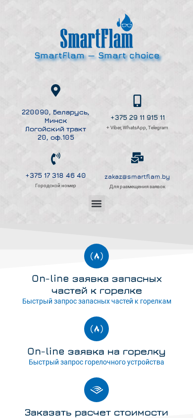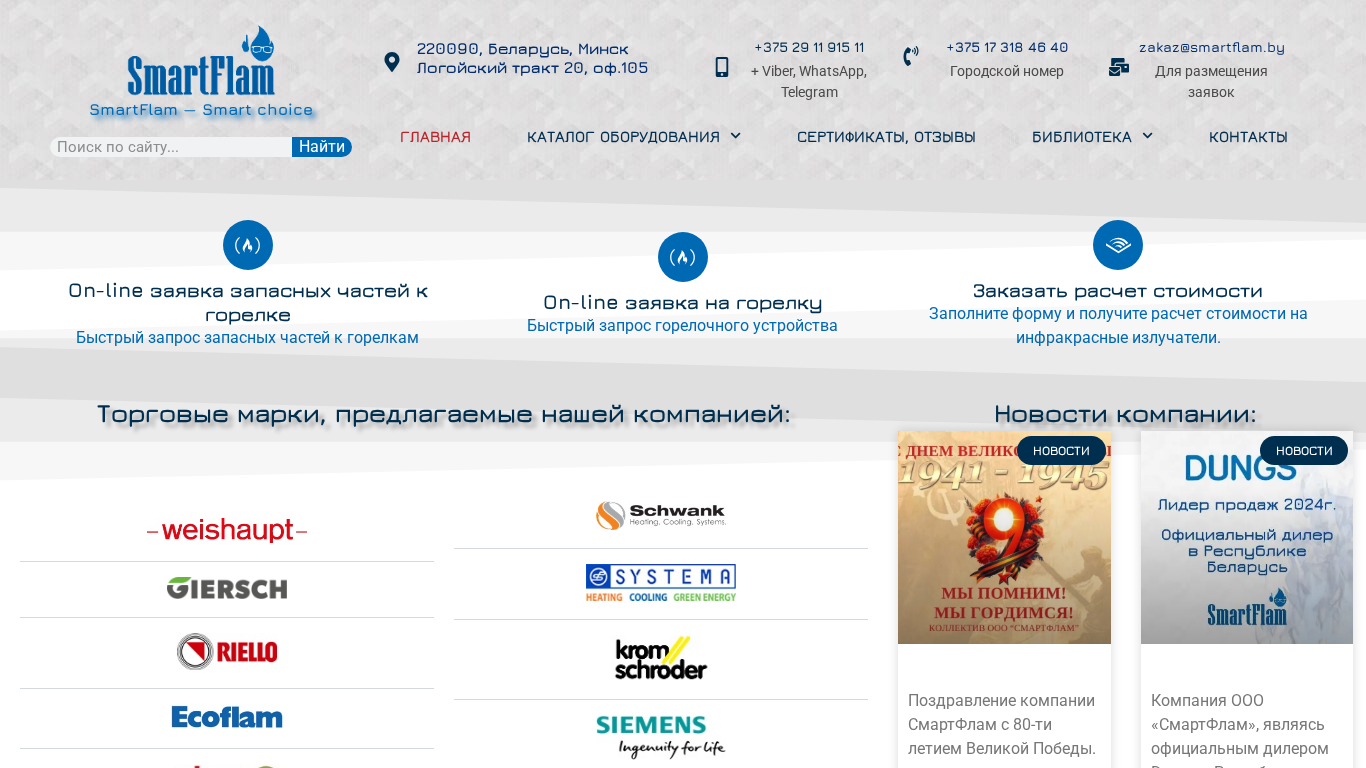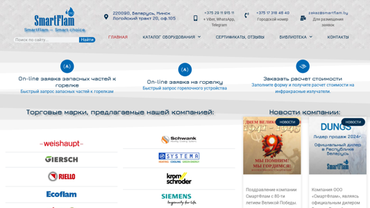 | AI-анализ | title: Инфракрасные горелки Weishaupt description: keywords: top_words: unp: fragment: img:is([sizes="auto" i], [sizes^="auto," i]) { contain-intrinsic-size: 3000px 1500px } This website, <https://smartflam.by>, is a business located in Belarus with the name SmartFlam LLC. The organization specializes in industrial infrared heaters and provides backup parts for burners. The website includes information about the company's location, which is at 20, Pobeditelei Avenue, in Minsk, Belarus, postal code 220090. The company can be reached through email at info@smartflam.by or via |