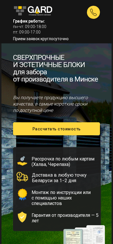 | AI-анализ | The web project "Gard-Block.by" is an e-commerce platform for buying concrete blocks for fences at an affordable price with delivery across Belarus. The company produces European-quality concrete blocks in-house near Minsk, with a minimum lifespan of 30 years. Services include delivery, self-pickup from the warehouse, free design project development, and simple installation instructions. The product comes with a 3-year manufacturer's warranty and complies with the relevant GOST standards. The website offers high-strength and aesthetically pleasing blocks for fences, with various heights, widths, and thicknesses available. Users can calculate the approximate cost based on the length of the fence, height of the fence (stiles), and width of the gaps between the stiles. Delivery is available to all parts of Belarus within 1-2 days, and financing options |