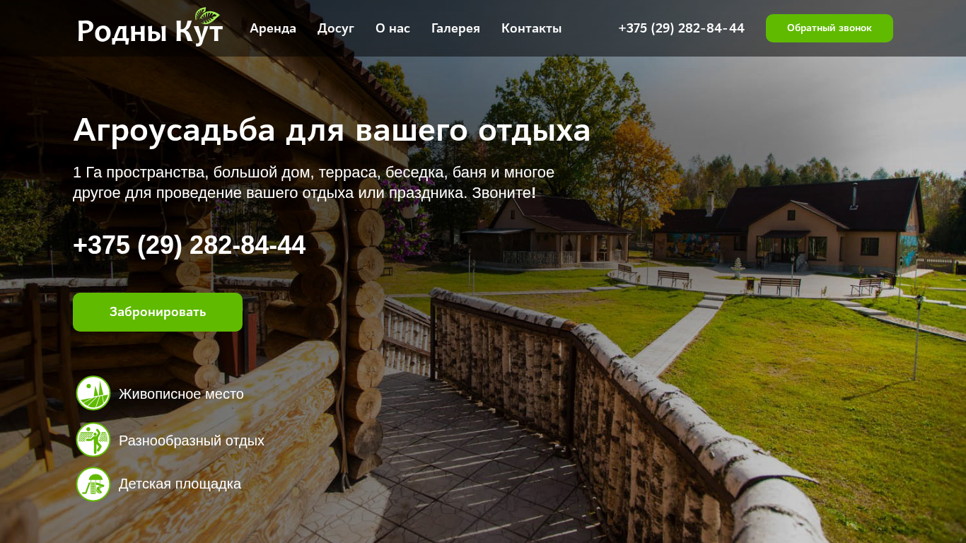 | AI-анализ | The portal "Agroestate 'Rodny Kut'" is an accommodation and recreation website offering various facilities for rent, including a large house, terrace, gazebo, sauna, and more for hosting vacations or events. The property features a children's playground, picturesque location, and diverse recreational activities. The two-story house can accommodate up to 30 people with six rooms for two-three person occupancy, a luxury room for newlyweds, a fully-equipped kitchen, two bathrooms in the house, meals on request, heating, warm floors, a Russian stove, a library, and a professional 12-foot billiard table. For active recreation, the estate provides a volleyball court, a mini-football, basketball, and 'Cities' playground area, billiards, air hockey, pneumatic target shooting, |