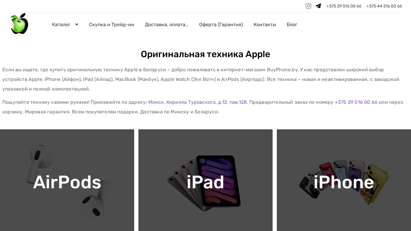 | SEO-описание | Купить технику Apple (Эпл) в Беларуси - iPhone, iPad, Mac и другие устройства. Доставка по всей Беларуси на BuyPhone.by. |