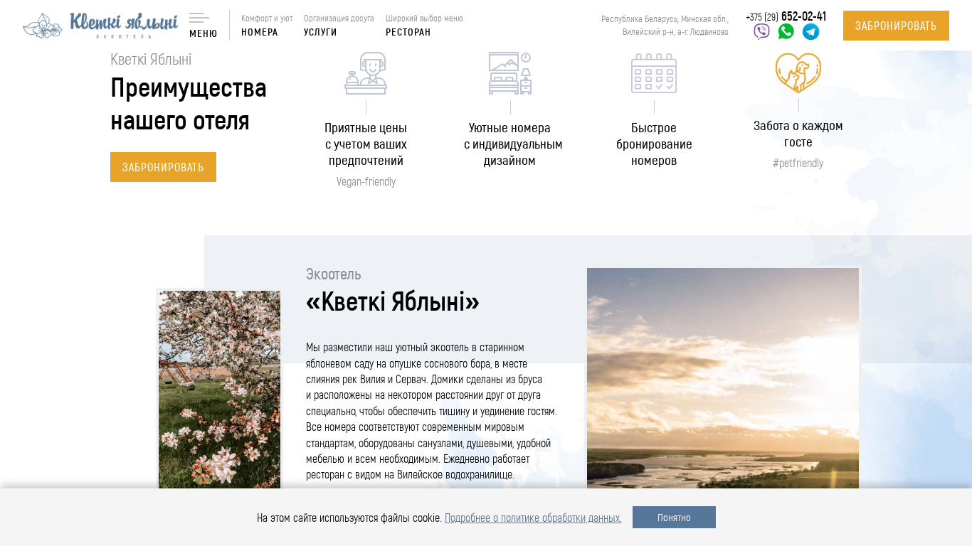| AI-анализ | The portal "Ecootel 'Кветки Яблыни' | База отдыха" is a Belarusian accommodation and recreation site located in the village of Ludvinovo, in the Viileysky district of the Minsk region. The title includes the words 'ecootel', 'Кветки Яблыни', 'отдых' (vacation), 'база отдыха' (recreation base), 'аренда' (rent), 'дом' (house), 'природа' (nature), and 'озеро' (lake). The description mentions 'снять усадьбу на озере' (rent a country estate), 'аренда усадьбы, дома на природе' (rent a country house in nature), and 'база отдыха, агроуса |