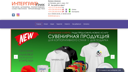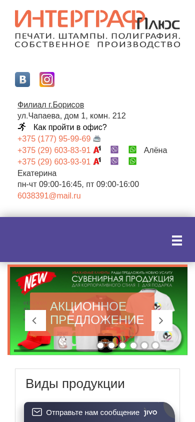 | AI-анализ | The portal "Intergraf Plus in Borisov" is a manufacturing company specializing in the production of seals and stamps for doctors, organizations, and IPs. The company is located in Borisov, on Chaapaeva Street, house 1, apartment 212. Clients can contact the office by phone at +375 (177) 95-99-69 or +375 (29) 603-83-91, or speak with Alena, Ekaterina, or Nadezhda. Office hours are Monday to Thursday from 9:00-16:45, and Friday from 9:00-16:00. The company offers various products, including organizational seals, seals for IPs, seals for doctors, stamp sets, daters, facsimile |