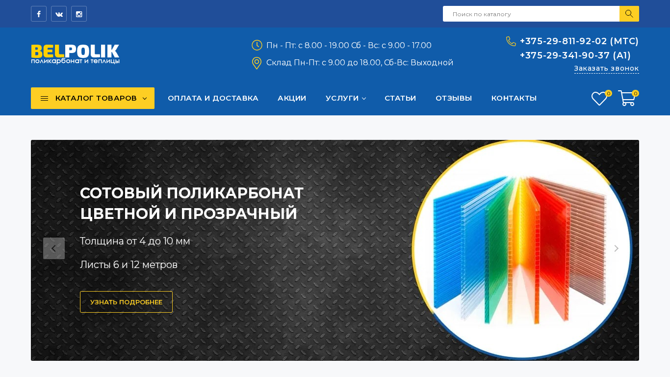 SEO-описаниеИнтернет-магазин BelPolik.by занимается реализацией качественных теплиц из поликарбоната, беседок, летних душей, сотового и монолитного поликарбоната по конкурентным ценам с доставкой по территории Беларуси.