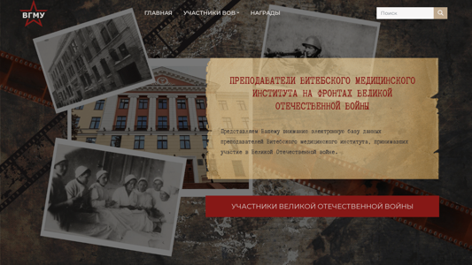 | AI-анализ | The web project "Vovvsmu.lib.vsmu.by" is dedicated to the biographies of professors from the Vitsebsk State Medical University (VSUM), who served on the front lines during the Great Patriotic War. The site provides information on participants in the war, order holders, and those awarded medals. It includes lists of doctors of science, candidates of science, honored doctors of the BSSR, and honored scientists of the BSSR. The main focus is on the professors of the Vitsebsk Medical Institute who fought in the war. The database is a part of the VSUM library and was copyrighted in 2025. |