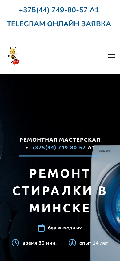 | SEO-описание | +375447498057 Ремонт стиральных машин в Минске. Ремонт стиралки Минск. Вызов мастера по ремонту стильной машины в Минске ◕‿◕ +375447498057 Низкие цены. Опытные мастера. Все бренды · Ремонт любых марок. Гарантия качества. Быстрый выезд. Любые Поломки. Гарантия 1 год. |