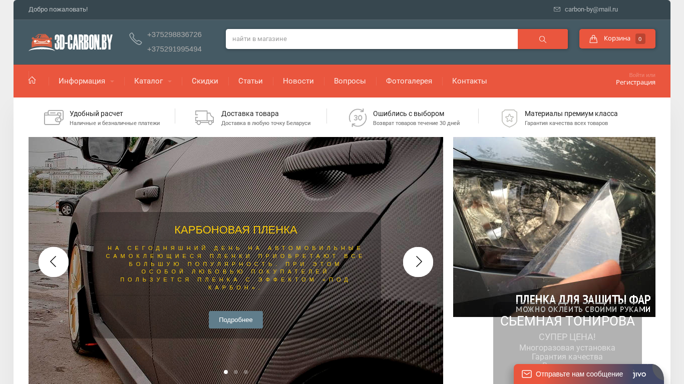 | SEO-описание | Продажа автомобильных пленок, тонировки, жидкой резины оптом и в розницу, глянцевая пленка под карбон, хром, золото, кожу, дерево, алюминий, матовая автопленка и винил. Доставка по Минску, Бресту и РБ. |