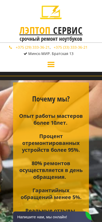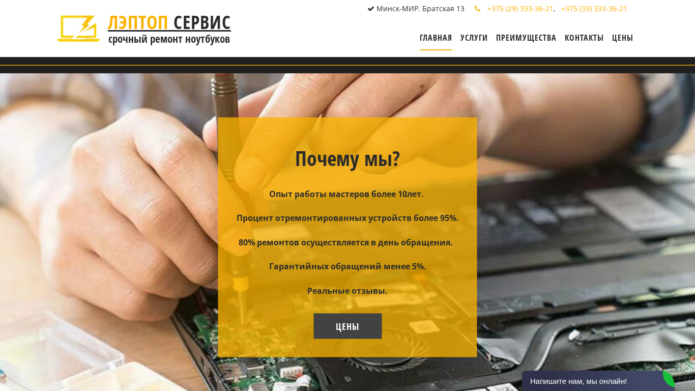 | AI-анализ | The website, titled "Главная" (Main), is a laptop repair service based in Minsk, Belarus. The description mentions the phone numbers +375 (29) 333-36-21 and +375 (33) 333-36-21 for contact, and the address "Минск-МИР" (Minsk-Mir). The website offers quick laptop repair services, stating that 80% of repairs are completed on the same day, with a guarantee of less than 5% of returned devices. The website boasts an experienced team with over 10 years of working experience, and a success rate of over 95% for repaired devices. The services offered include repair and replacement of various laptop components, such as motherboards, displays, and batteries, as well as software installation and optimization. |