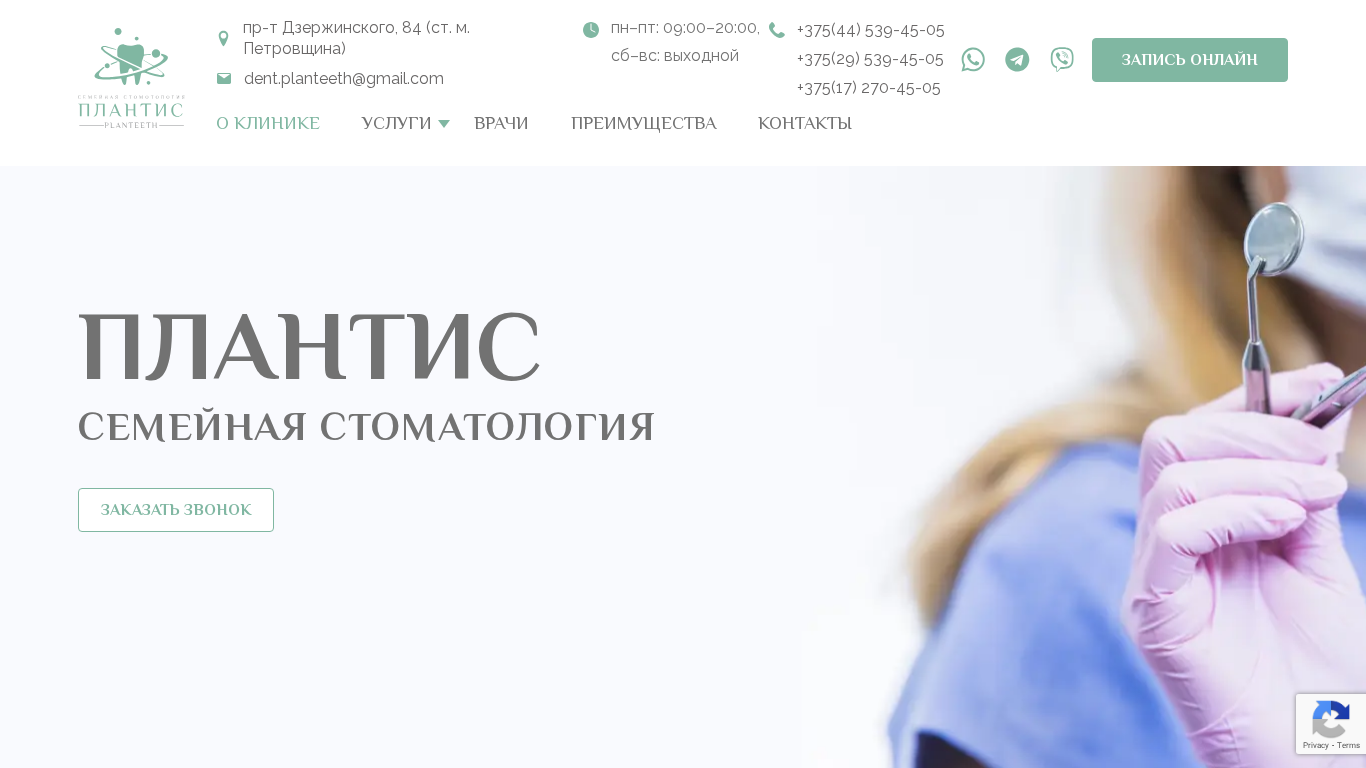 | AI-анализ | This website is for a private dental clinic named Planteeth in Minsk, Belarus. The clinic, located at pr-t Dzerzhinsky, 84 (Petrovschina metro station), offers modern equipment and highly qualified specialists for dental services. The services provided include therapeutic dentistry, orthodontics, rentgen diagnosis, surgical dentistry, and prosthetic work for teeth and implants. Patients can contact the clinic for appointments via phone numbers +375 44 539-45-05, +375 29 539-45-05, and +375 17 270-45-05. The clinic also offers online appointment booking. The clinic's services include therapeutic dental work, caries and root canal treatment, professional dental hygiene, |