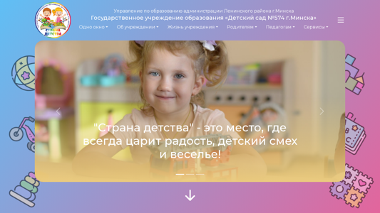 | AI-анализ | This website is a state educational institution for preschool children, named "Детский сад №574 г.Минска" (Child Care Center No.574 of Minsk). The title of the website is missing, but based on the keywords and the description, it can be inferred that it is likely to include phrases such as "Child Care Center" or "Preschool Institution" in the title. The description mentions that the website provides information about the institution's administration, schedule of work, administrative procedures, electronic application process, popular inquiries, and contacts. The top_words list shows that the website contains information about the size of the font, the color scheme of the website, and the fact that it is a one-window institution, meaning that all administrative procedures can be completed in one place. The website also offers services such as situational assistance for disabled individuals, a |