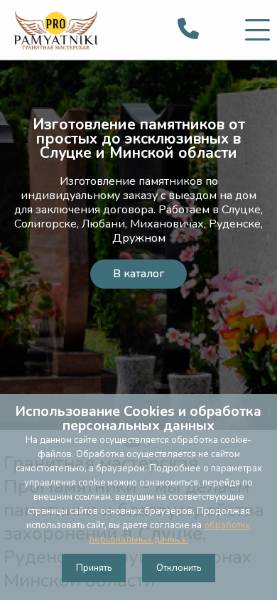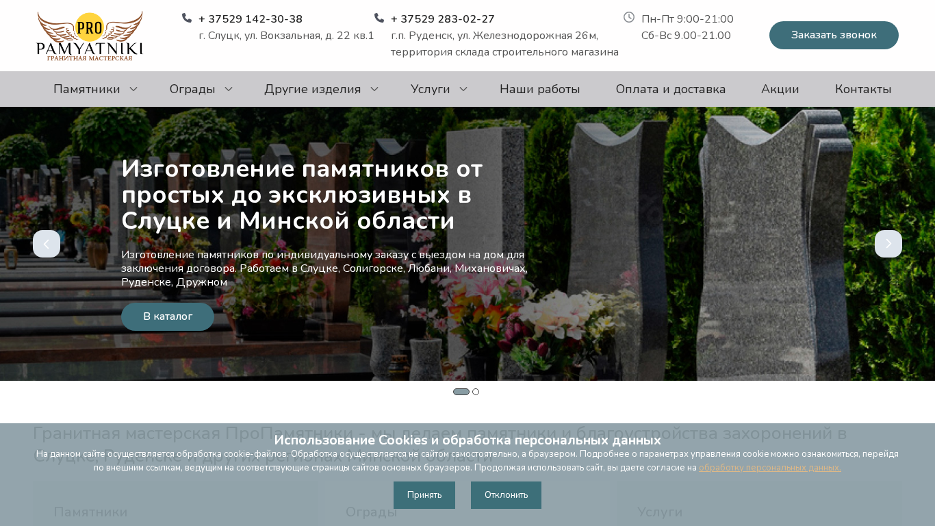 | SEO-описание | Изготовление надгробных памятников в Слуцке и Минской области. Заказать памятник под ключ. ✓ Рассрочка. ✓ Выгодные цены. ✓ Высокое качество. ✓ Гарантия. ☎ Звоните: + 37529 142-30-38. |