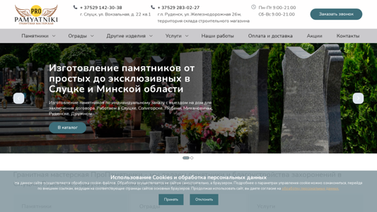 | AI-анализ | This website is a memorial monument production and sales company based in Slutsk, Belarus, with a secondary location in Rudensk. The company specializes in the manufacturing and installation of memorial monuments and gravesite accessories in Slutsk and the Mininsky region. The website offers a variety of memorial monuments, including single and double ones, in different shapes like crosses and hearts, as well as exclusive and affordable options. Additionally, the company provides metal and granite ogradas, other decorative items for cemetery embellishment, and services such as monument installation, foundation construction, and cemetery improvement. The website offers financing, competitive prices, and a guarantee for their products. Contact information includes two phone numbers, one for the Slutsk office and one for the Rudensk office, with operating hours listed. The company works in Slutsk, Soligorsk, Lyubani, Rudensk, Mik |