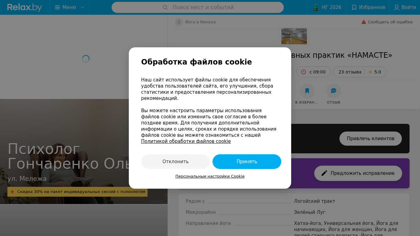 | SEO-описание | Студия телесных и духовных практик НАМАСТЕ в Минске – отзывы, адрес на карте, телефоны, график работы и карта проезда на Relax.by |