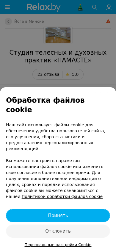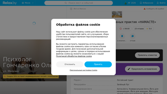 | AI-анализ | --- The portal Namaste.relax.by is a studio for physical and spiritual practices located in Minsk, Belarus, at Melezh Street 1. It offers yoga classes, including Hatha-yoga, Universal yoga, yoga for beginners, yoga for women, yoga for the elderly, yoga for the back, Aiyengar yoga, Shri Shri yoga, Daoska yoga, Kriya-yoga, relaxing yoga, adapted yoga, and yoga therapy. The studio also provides massage therapy and family yoga. The studio has received 23 five-star reviews and is located near the Logoysky Trakt and the Green Garden microdistrict. The studio is open until 10 PM. The website provides a search function for places and events, a menu for Yoga in Minsk, a way to report errors, and a way for businesses to attract more clients. The |