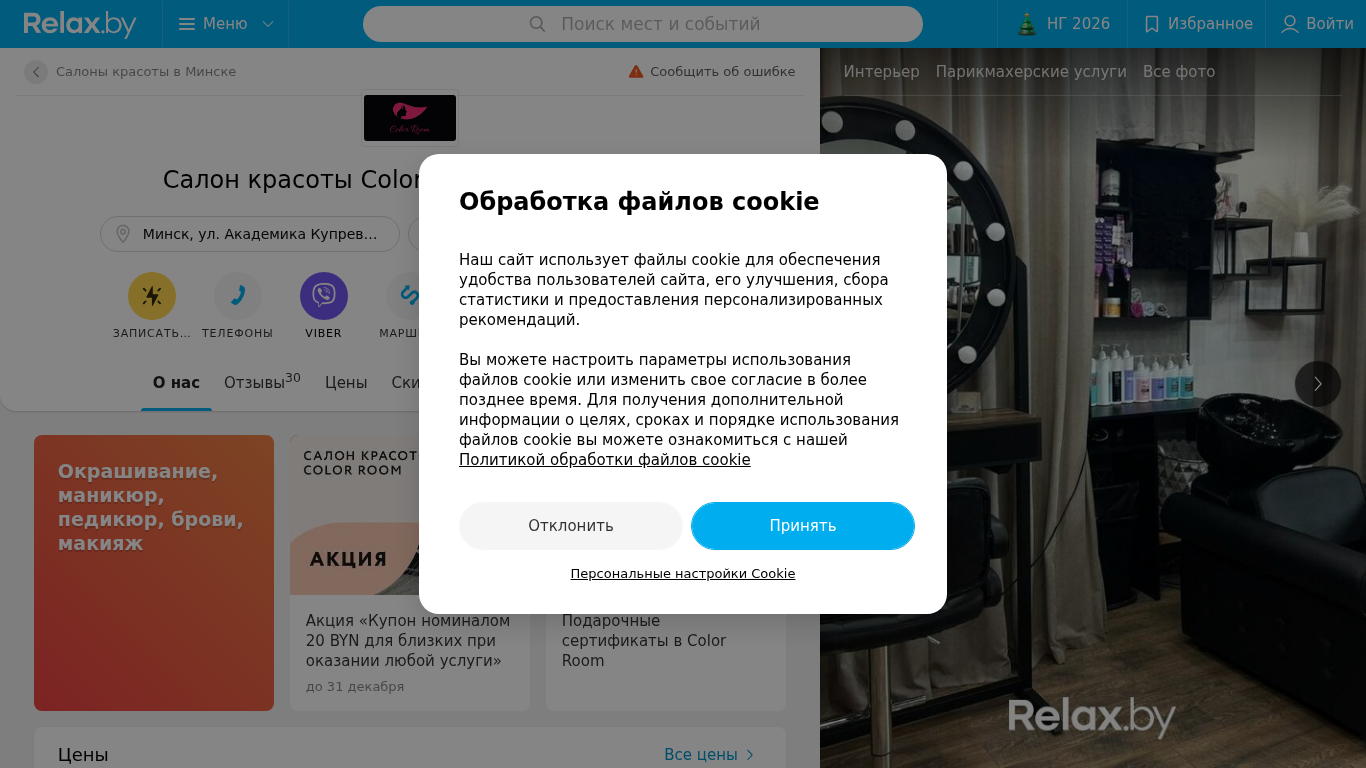 | SEO-описание | Салон красоты Color Room (Колор Рум) в Минске , ул. Академика Купревича 18 – отзывы, адрес на карте, телефоны, график работы и карта проезда на Relax.by. |