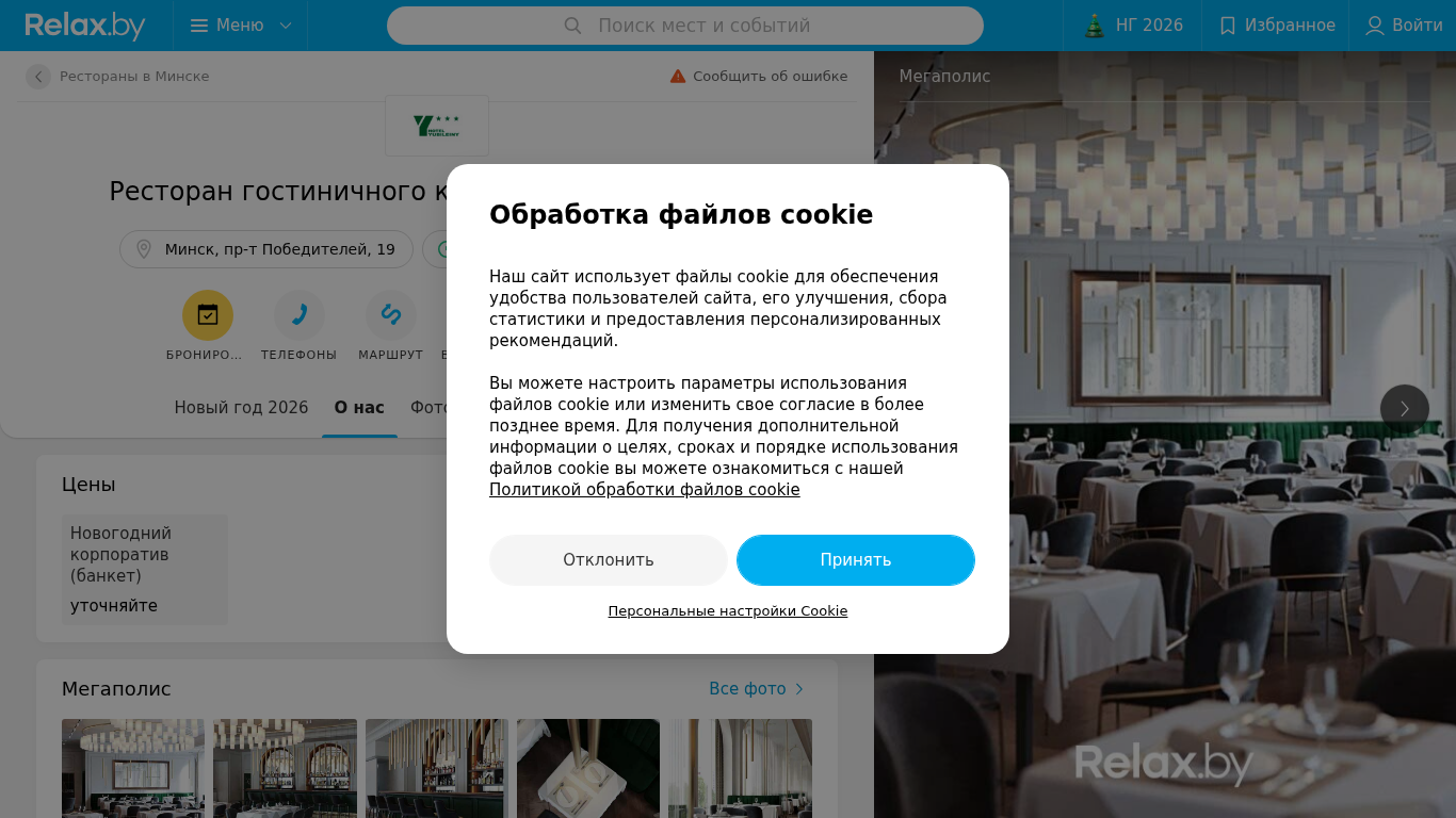 | SEO-описание | Ресторан гостиничного комплекса Мегаполис в Минске – отзывы, телефоны, график работы и карта проезда на Relax.by |