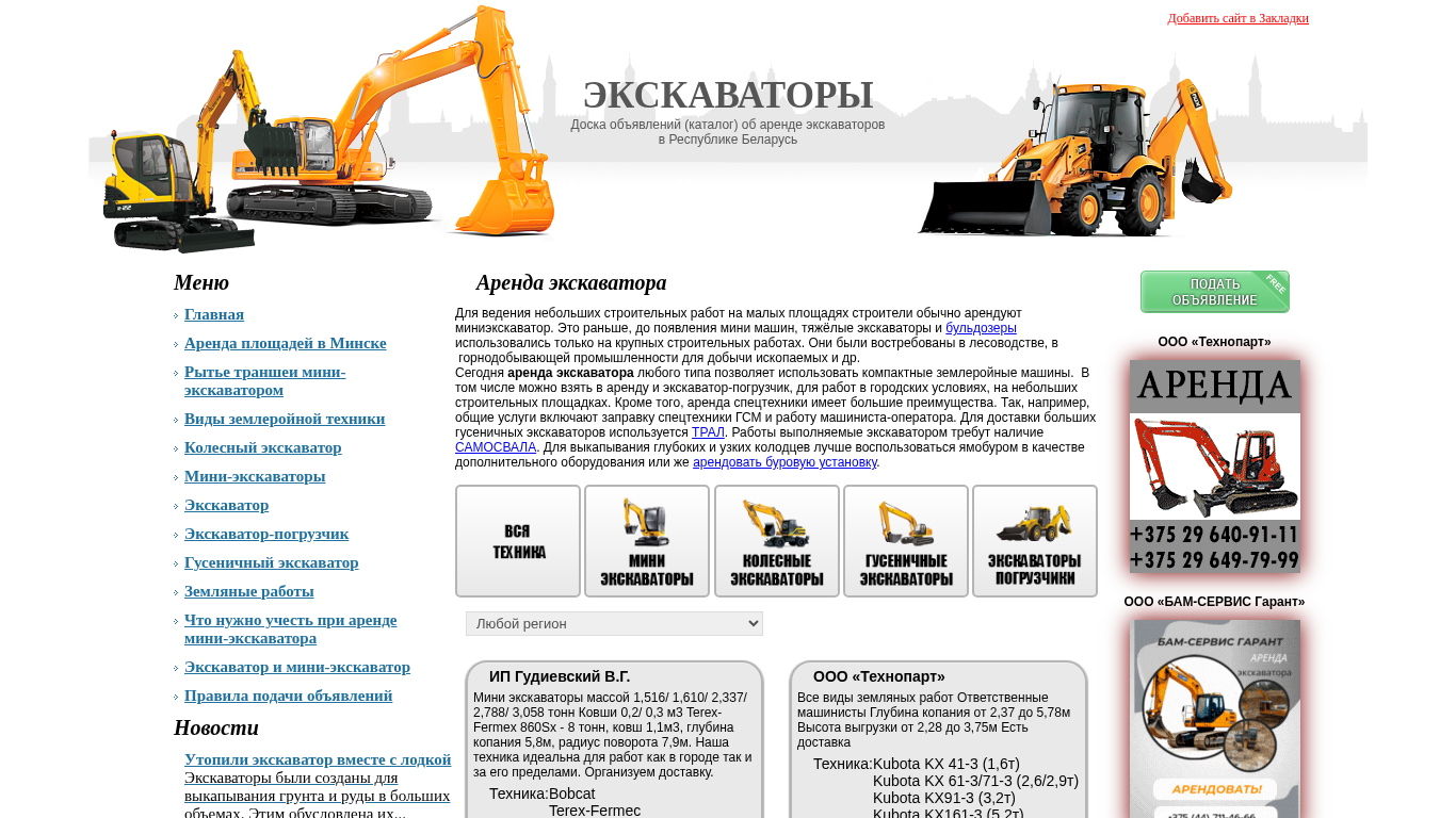 | SEO-описание | Объявления об аренде экскаваторов в Беларуси. Аренда экскаватора. Услуги экскаватора-погрузчика. Мини экскаватор в аренду. Рытье траншей под газ, воду, канализацию, планировка участка, установка колодцев, разгрузка-погрузка грузов. |