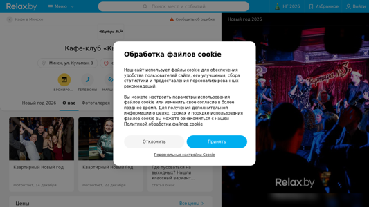 | AI-анализ | The website <kvartira-3.relax.by> is a cafe-club located in Minsk, Belarus, at the address Кульман, 3. It provides reviews, an address map, telephone numbers, working hours, and a route planner. The cafe-club is named "Квартира №3" and has received 477 reviews with an average rating of 4.1. The website includes a menu with prices, photos, and video. Services offered include a New Year's Eve celebration and event booking. The cafe-club is located in the Soviet district, near the Metro Ploshchad Yakuba Kolasa station, and can be reached via Vk, Facebook, or Instagram. The menu includes items such as a meat platter, fresh vegetables, a cheese platter, a set "under the vodka," and a set "P |