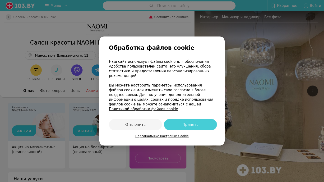 | SEO-описание | Салон красоты NAOMI beauty & SPA (НАОМИ) Минск пр-т Дзержинского 125а – телефоны, время работы, отзывы и схема проезда в каталоге медицинского портала 103.by. |