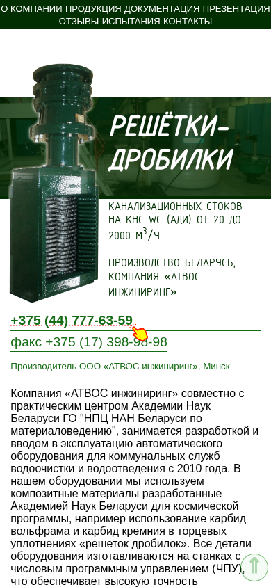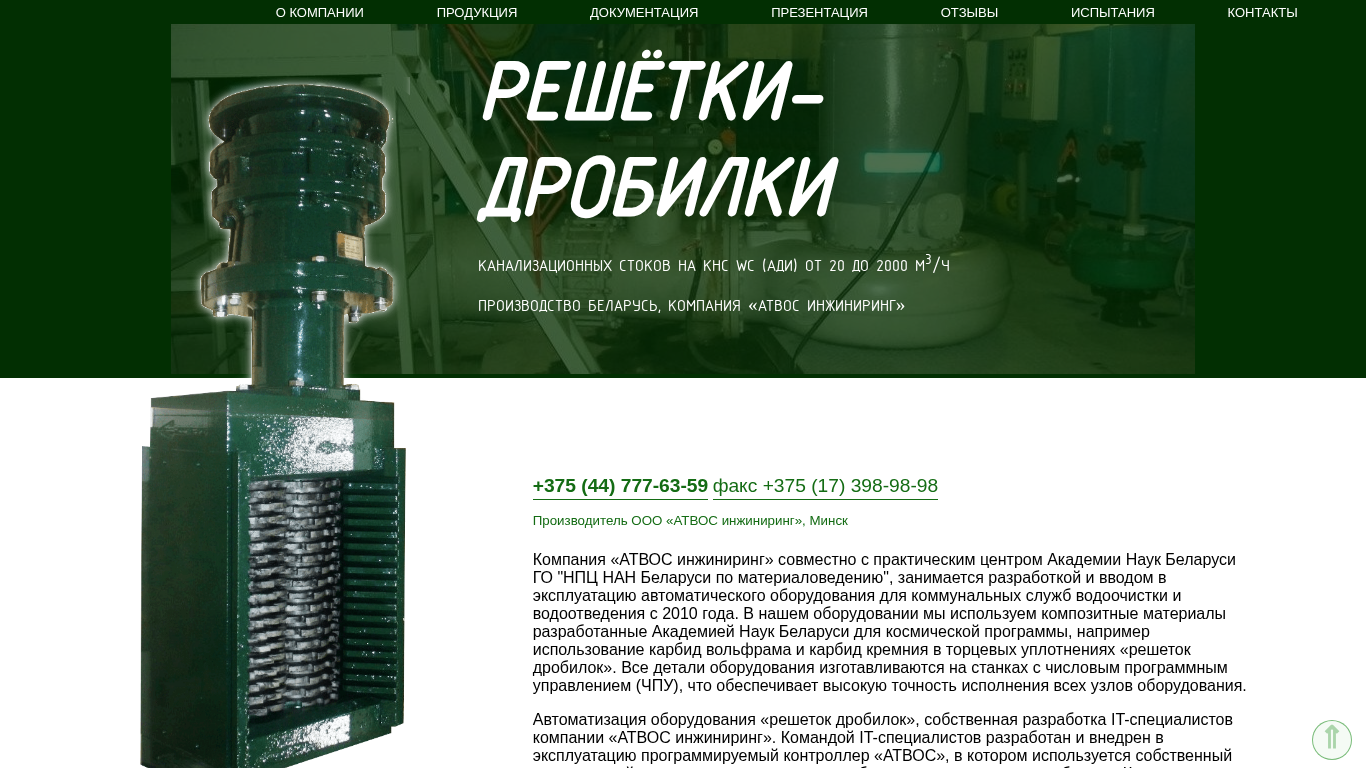 | Название / Заголовок | Атвос инжиниринг, Минск - Решётки-дробилки собственного производства - Измельчители канализационных стоков КНС - Агрегаты дробления и измельчения канальные - Цены, характеристики |