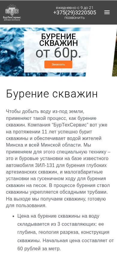This website is an online platform for a water well drilling company based in Minsk, Belarus, named 'БурТехСервис'. The company specializes in drilling water wells and provides related services, including well maintenance and installation of hydraulic accumulators. The website offers discounts for combined drilling and installation services, as well as for hydraulic accumulators. Prices for drilling water wells depend on their depth, geology, and construction. The company uses specialized drilling equipment, including mobile rigs and stationary rigs on trucks and caterpillar tracks, respectively. The website provides a phone number for consultation and quotes.