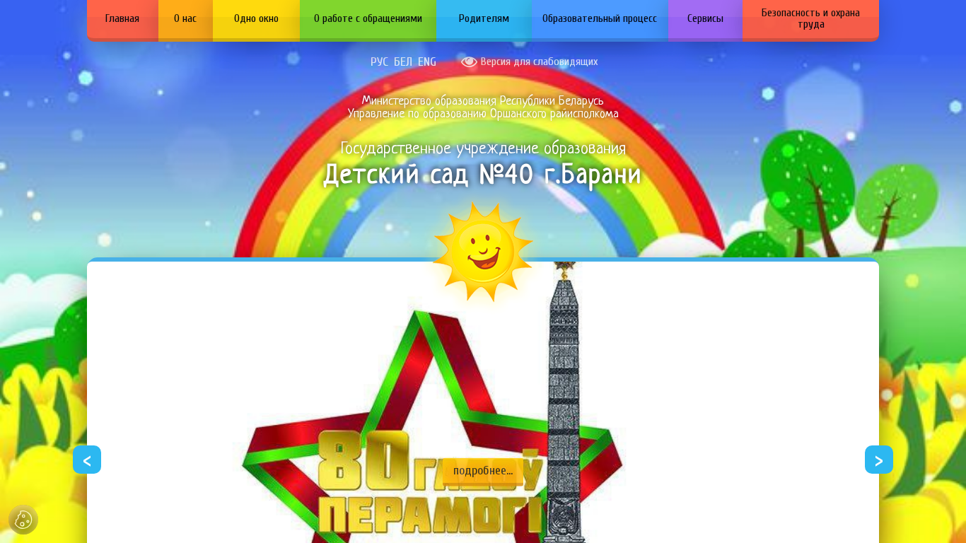 | AI-анализ | This online resource is a website for a kindergarten named "Detsky sad #40 g.Barani" (Children's Garden #40 in Barani). The title and description suggest that it is a government institution located in the city of Barani, Belarus. The website provides information about the kindergarten's structure, work schedule, and various educational and administrative aspects. It also includes sections on the institution's history, traditions, and achievements, as well as rules for pedagogical workers and conditions for admission. The website offers a photo gallery, information about the union, and various local documents, including registration and licensing information. The primary keywords associated with the site are "children's garden," "Barani," and "education." The site also includes sections on state symbols, social-psychological services, and a memorandum on sexual non-interference. |