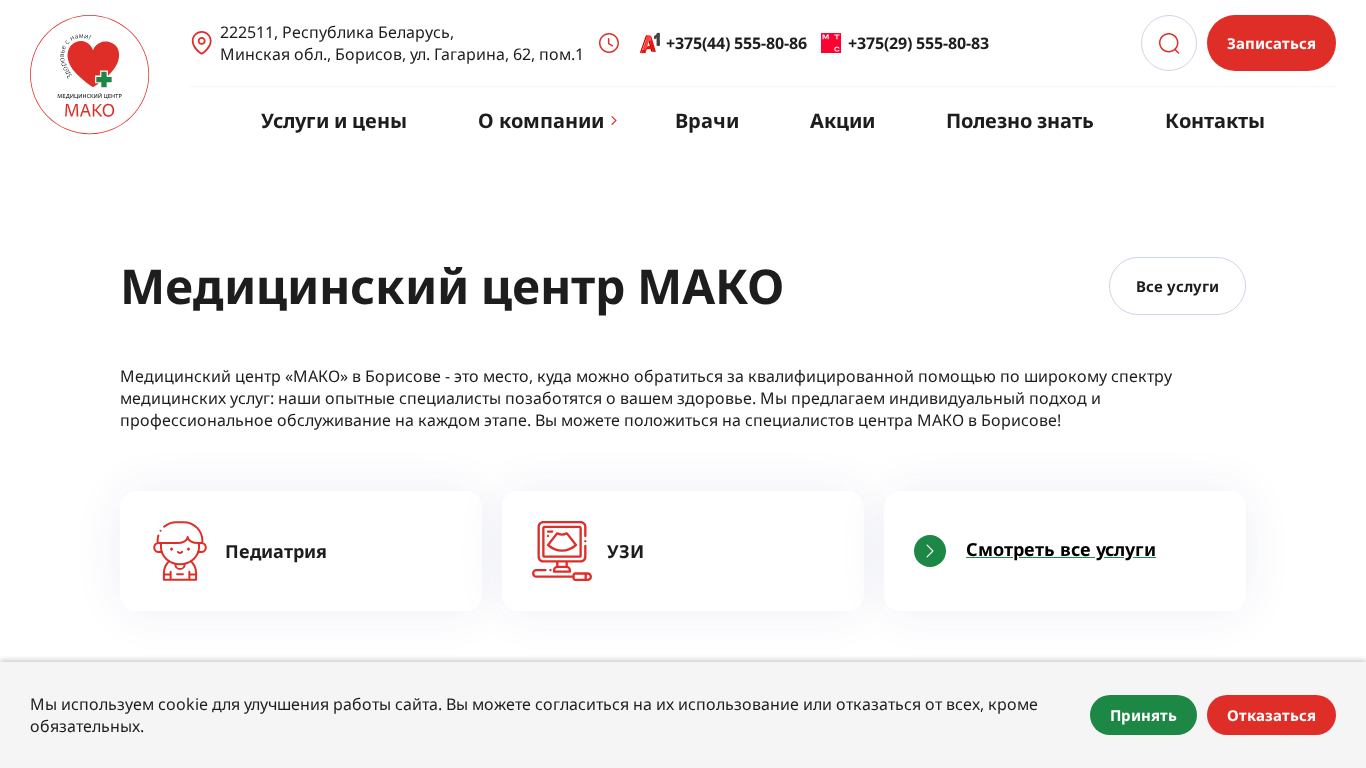| Адрес | Медицинский центр Мако: Ваш надежный путь к здоровью, 222511, Республика Беларусь, Минская обл., Борисов, ул. Гагарина, 62, пом.1 |