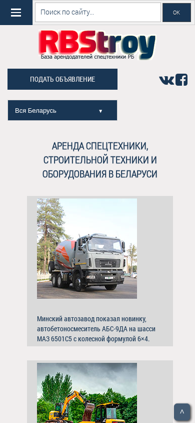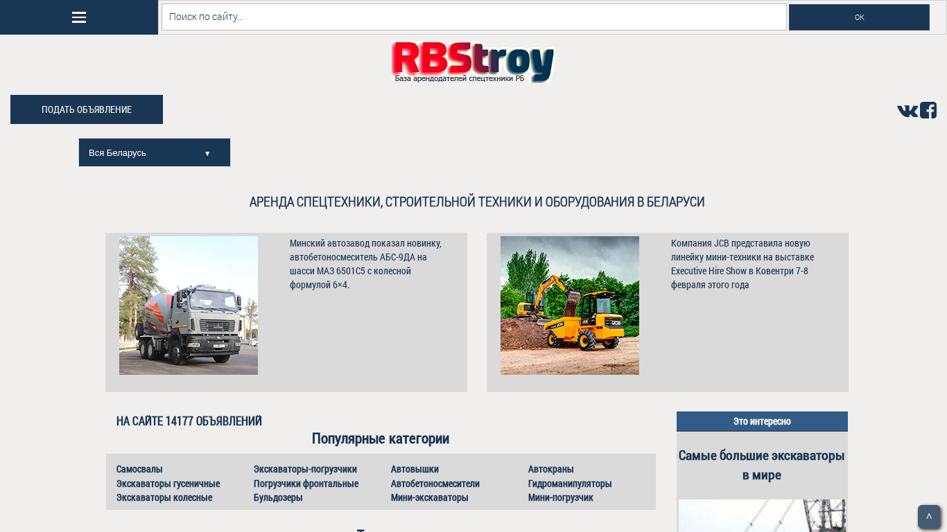 | AI-анализ | The portal RBStroy.by is a rental marketplace for special machinery and construction equipment in Belarus. It provides a unified database for organizations and entrepreneurs offering rentals in Minsk and throughout the country. The website features 14,177 rental listings, with popular categories including excavators, cranes, and self-loading trucks. Companies like Belarusian Automobile Plant display new offerings, such as the ABC-9DA concrete mixer on a Minsk Automobile Plant chassis. JCB recently presented a new line of mini machinery at the Executive Hire Show in Coventry. The site offers various categories for land and borehole work, such as bulldozers, mini-excavators, and drilling equipment. |