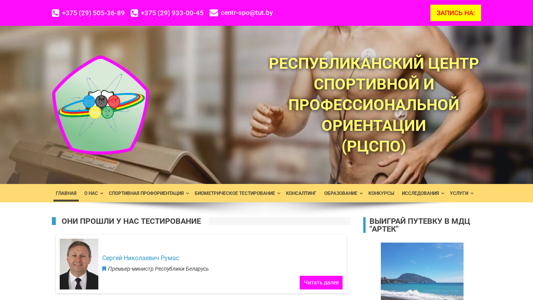 | AI-анализ | This website is for the Republican Center for Sportive Professional Orientation (РЦСПО) in Belarus. The website provides information about the center's sports diagnostics, which uses biometric testing to determine a child's aptitude for various sports. The center also offers partnerships, payment information, contacts, and details about its leadership and successful athletes who have undergone testing. Additionally, the website mentions educational opportunities such as a Republican school, courses, and seminars. The domain name is rcspo-best.by. |