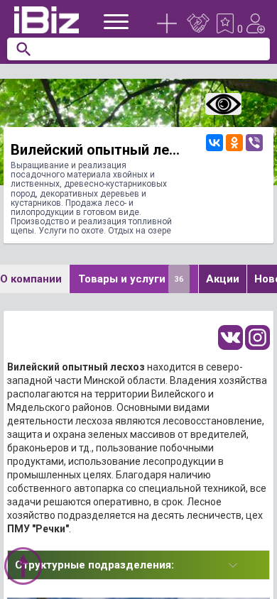| Название / Заголовок | Вилейский опытный лесхоз Государственное опытное лесохозяйственное учреждение - Выращивание и реализация посадочного материала хвойных и лиственных, древесно-кустарниковых пород, декоративных деревьев и кустарников. Продажа лесо- и пилопродукции в готовом виде. Производство и реализация топливной щепы. Услуги по охоте. Отдых на озере. 222410, Вилейка, , Стахановская, 221 |