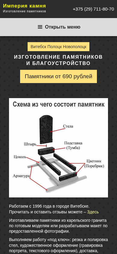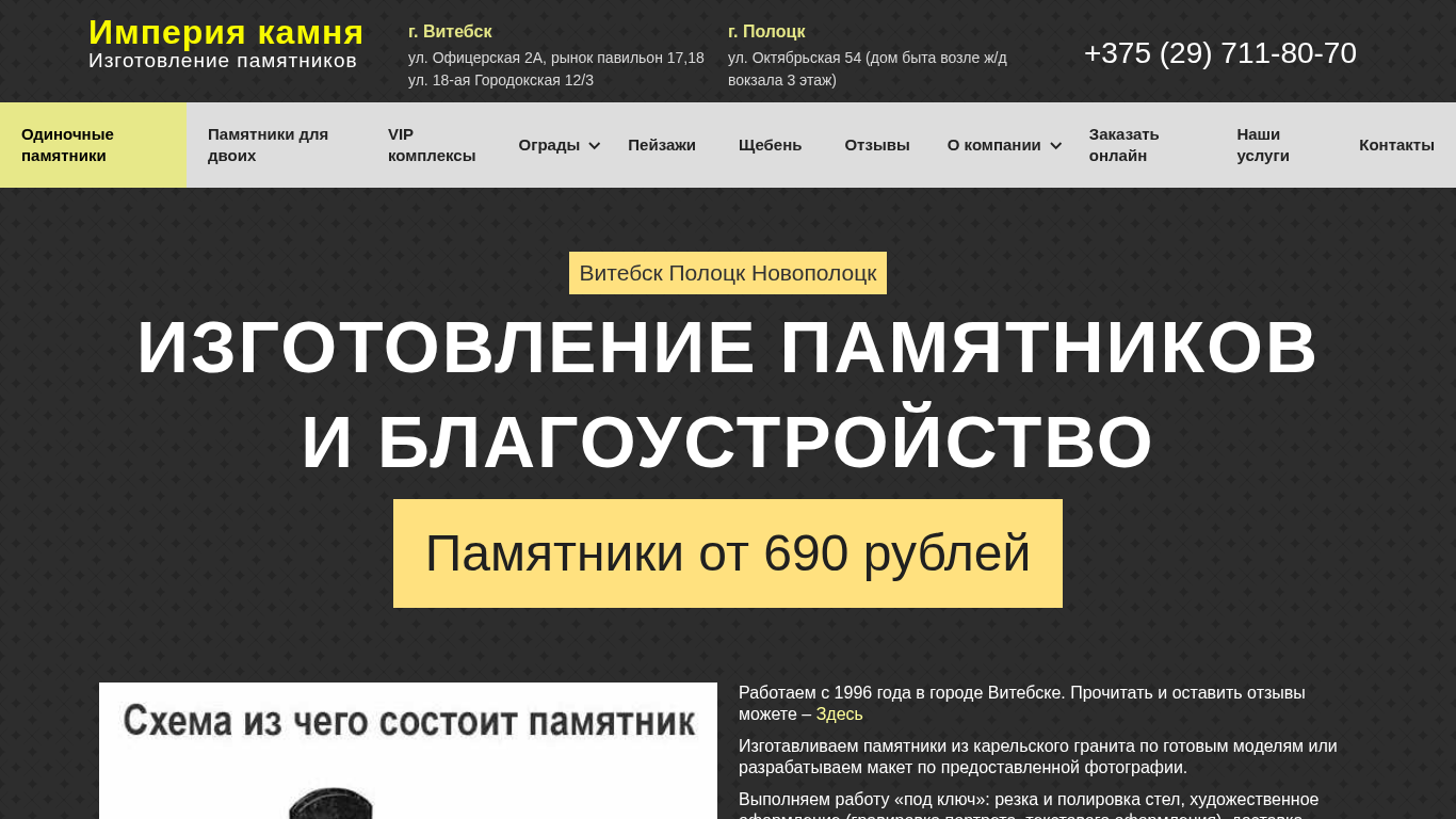 | SEO-описание | Изготовление памятников в Витебске, Полоцке, Новополоцке. Низкие цены. Гарантия на изделия. Благоустройство мест захоронения. Ограды. Венки. Щебень. Работа по индивидуальному заказу |