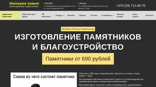 | AI-анализ | --- The web project "Imperia Kamnia" specializes in creating memorials in the cities of Vitebsk, Polotsk, and Novopolotsk. They offer low prices and a guarantee on their products. The company also provides landscaping services for burial sites, as well as fences, wreaths, and gravel. Clients can place individual orders for monuments, as well as VIP complexes, oval-shaped columns, and crests. Other services include landscaping and the sale of various ritual items. The company has been operating since 1996. |
