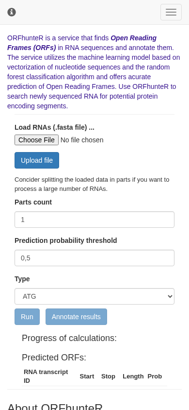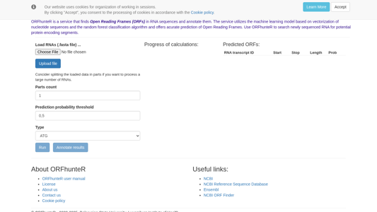 The website ORFhunter.bsu.by is dedicated to ORFhunter, a software tool for the automatic identification of open reading frames (ORFs) in human mRNA molecules. The website provides information about the software, its functionality, and usage. Users can upload RNA sequences in FASTA format for analysis, select the type of ORF they are looking for, and set a prediction probability threshold. The software uses a machine learning model based on vectorization of nucleotide sequences and the random forest classification algorithm for accurate prediction of ORFs. The website also includes links to useful resources such as the NCBI Reference Sequence Database and Ensembl. The team behind ORFhunter is based at the Systems analysis and Computer Modelling department and the Department of Genetics at Belarusian State University. The website uses cookies for session organization.