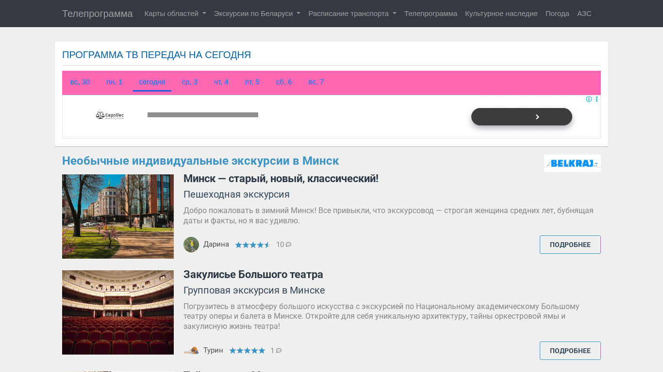 | AI-анализ | This online resource provides a TV program guide for all channels in Belarus. The online TV schedule includes programming for today and the upcoming week, with annotations for each channel. Users can watch the TV program for free. The website also offers information on excursions, transportation, and maps for various regions in Belarus, including Brest, Vitsebsk, Homiel, Hrodna, and Minsk. Additionally, the site features schedules for public transportation in Minsk and other cities, as well as transportation schedules from bus and train stations. The site also includes a cultural heritage section, weather information, and a list of gas stations. |