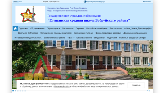 | AI-анализ | The portal 'Глушанская средняя школа Бобруйского района' is a Belarusian educational institution website with a focus on secondary education in the Bobruisk region. The title of the site is 'Глушанская средняя школа Бобруйского района' (Glushanskiy Srednyaya Shkola Bobruyskogo Rayona in English). The description section includes information about the use of cookies and the agreement to privacy policy. The site contains sections on the structure and operation of the school's administration, schedules for citizen reception, administrative procedures, electronic applications, contacts, and various services provided by the institution and public organizations. The site also includes a rating system for evaluating the quality of services and administrative procedures, as well as a gallery of photos and videos. The main objectives and functions of the educational institution are stated, along with a policy |