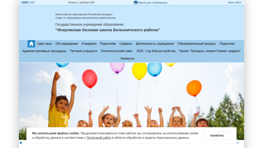 | AI-анализ | The website is that of the "Iskrovskaya Bazovaya Shkola Belynichskogo Rayona" or Iskrovskaya Base School of Belynichsky Rayon in Belarus. It is an educational institution under the Ministry of Education of the Republic of Belarus, specifically located in the Belynichsky Region. The homepage features a standard layout with a large title and a smaller subtitle, both in the Russian language. The graphic design is simple with a gray color scheme and text-based content. The top menu contains links to various sections such as the administration, pedagogical collective, and contacts. The website also includes information on the school's schedule, rules, and fees for students and parents. Additionally, there are sections for important documents, news, and a parent university. The website is accessible via a single window and is designed for standard font sizes and default sp |